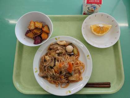 献立 五目あんかけそば、かわり大学いも、はるか、牛乳