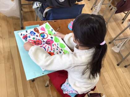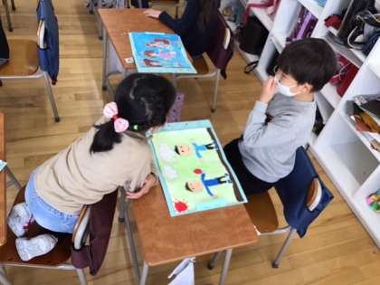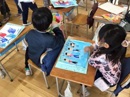 図工の時間です。新しい1年生の教室に飾る絵を選んでいます。みなさんは、もうすぐ2年生ですね。