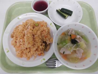 献立 チキンライス、ベーコンと野菜のスープ煮、きゅうりの甘酢漬、ぶどうゼリー、牛乳
