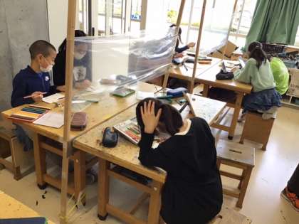 図工の時間です。鏡をじっくり見ながら、自画像に挑戦しています。
