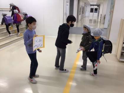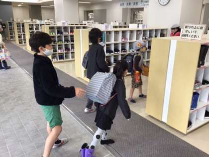 新学期の登校時に初めて雨になりました。6年生のお世話もあり、1年生もスムーズに登校できました。