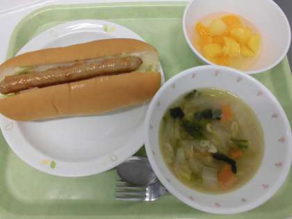 献立 セルフウインナードッグ、ABCスープ、フルーツポンチ、牛乳