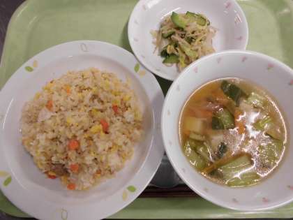 献立 チャーハン、白菜の中華サラダ、チンゲン菜のスープ、牛乳