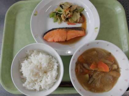 献立 ご飯、鮭の照り焼き、小松菜のおかか和え、具だくさんみそ汁、牛乳