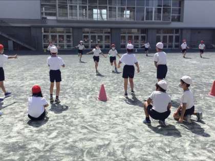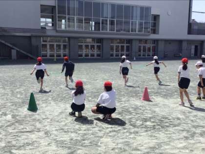 体育の時間です。テープを二人でもって、二人三脚のようなリレーに取り組んでいます。