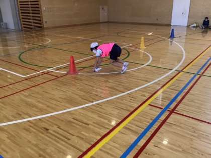 体育の時間です。体つくりの運動です。雑巾がけリレーに取り組んでいます。