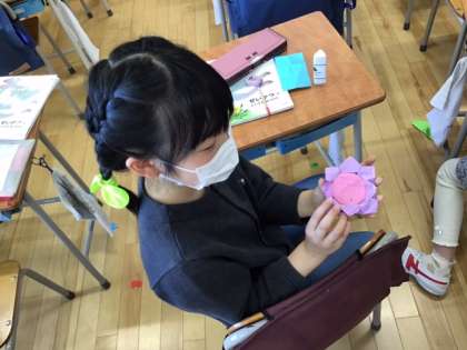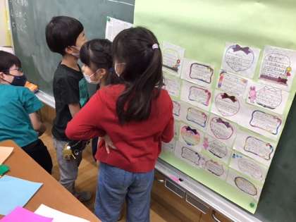 生活科の時間です。1年生に向けて、メッセージカードを書いています。やさしい2年生になってくださいね。