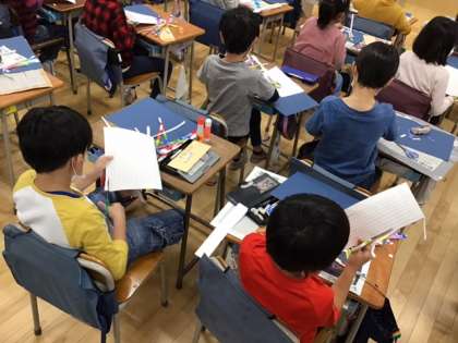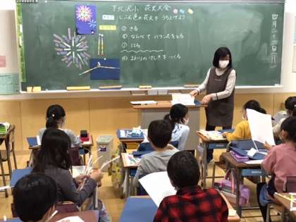 図工の時間です。「下北沢小 花火大会」切って、並べて、貼って、自分色の花火を打ち上げます。