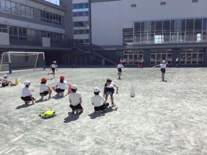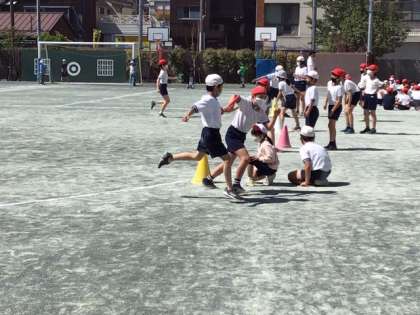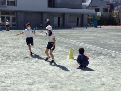 体育の時間です。リレーに取り組んでいます。バトンの受け渡しが上手です。