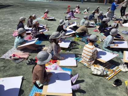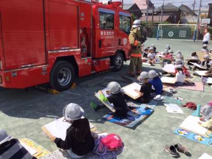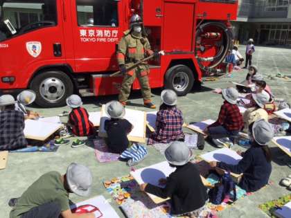 北沢消防署の方が来てくださっています。近くで見る消防車は、すごい迫力ですね。