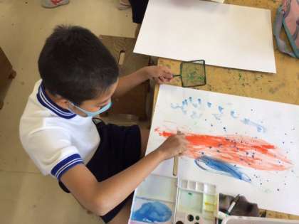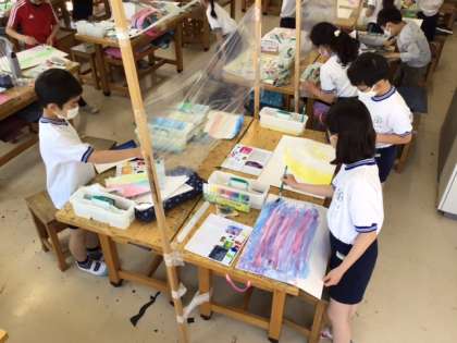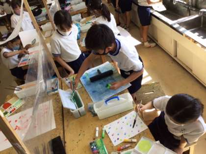 図工の時間です。「絵の具のぼうけん たのしさ発見!」思いがけない形や色を楽しみながら、作品を作っていきます。