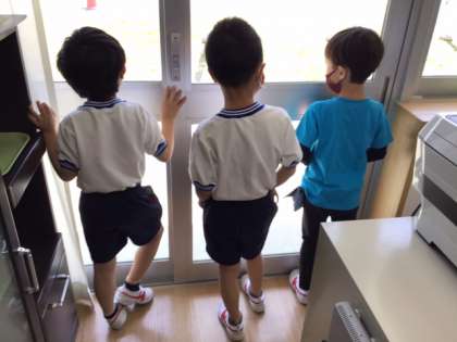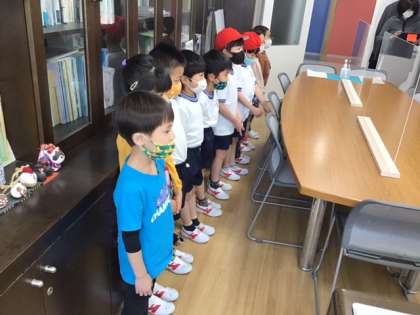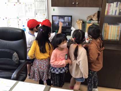 生活科の時間です。「なかよし いっぱい だいさくせん」1年生が学校をよく知ろうと学校探検をしています。校長室では、礼儀正しく、質問もたくさんしてくれました。