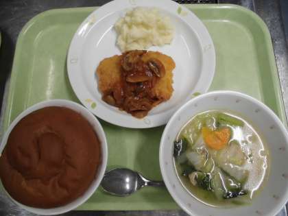 献立 ココアパン、イカフライのマッシュルームソースがけ、マッシュポテト、白菜スープ、牛乳