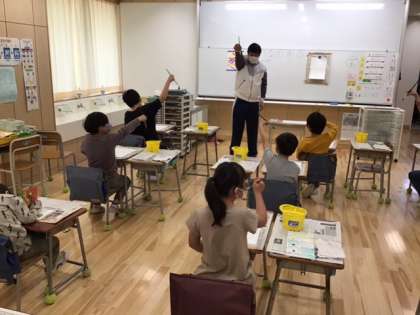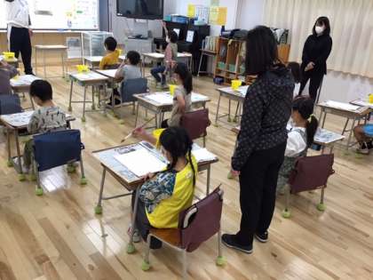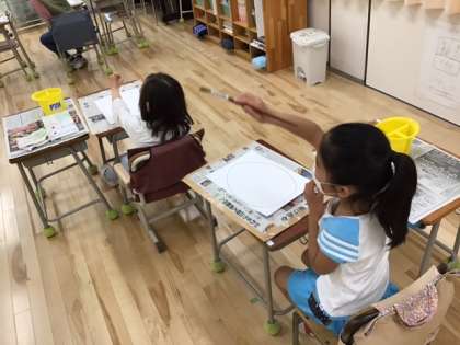 図工の時間です。「ふしぎなたまご」まずは、筆の使い方の復習です。
