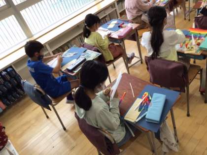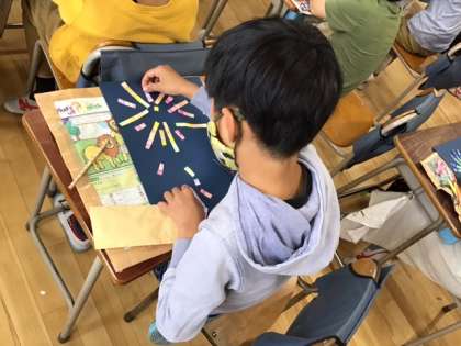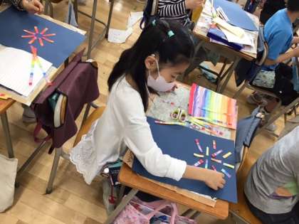 図工の時間です。切って、並べて、貼って、いよいよオリジナル花火の完成です。