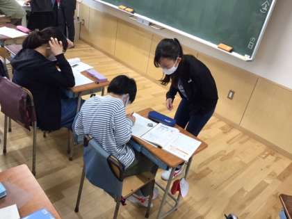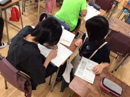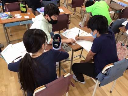 算数の時間です。分数と整数のかけ算、わり算のまとめに取り組んでいます。お互いに教え合いながら学習を進めています。