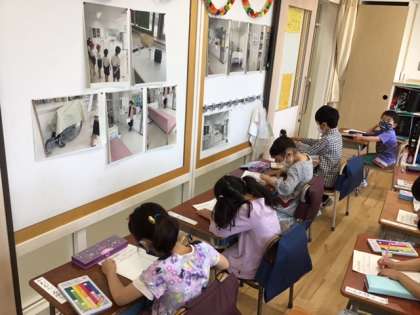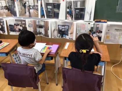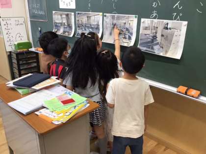 生活科の時間です。グループごとに、学校探検のまとめをしています。