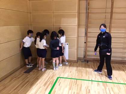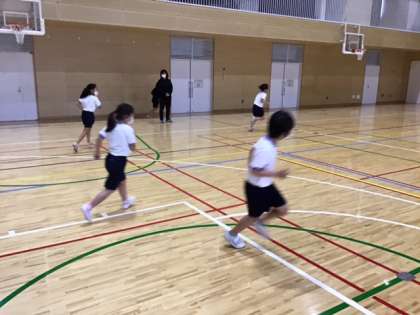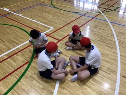体育の時間です。熱心に作戦会議をして、こおり鬼で勝負です。