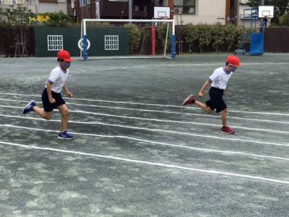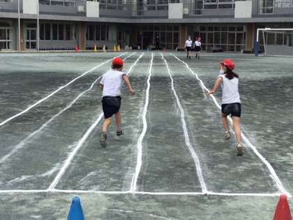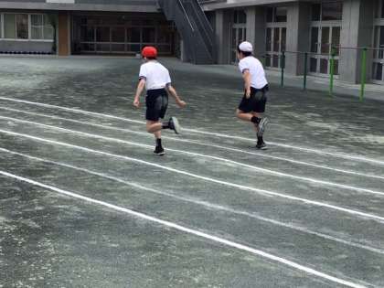 体育の時間です。今日は、50メートル走の記録をとっています。記録更新できたかな。