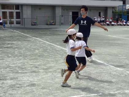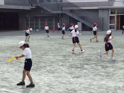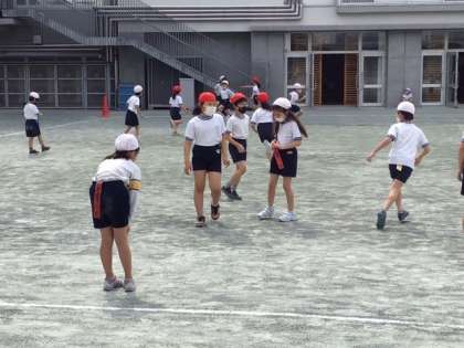 体育の時間です。タグを尻尾にして、しっぽとり鬼で楽しく動いています。