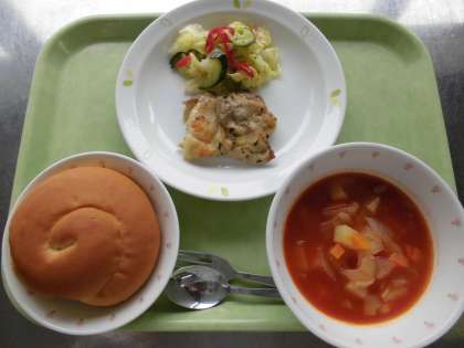 献立 ミルクパン、鶏肉のバジル風味、野菜のレモンドレッシングサラダ、ミネストローネ、牛乳