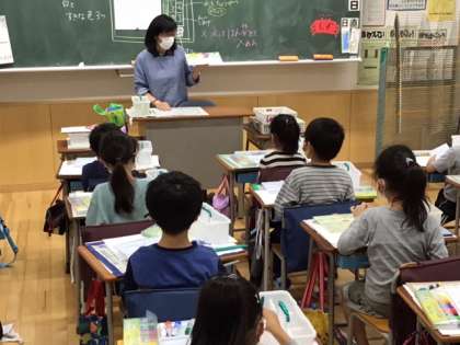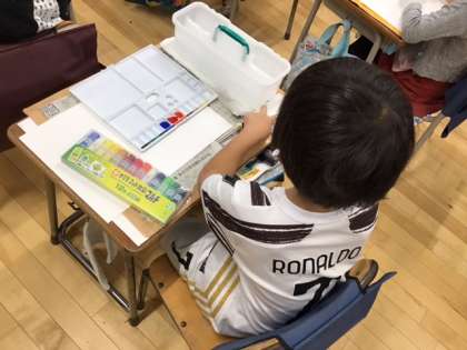 図工の時間です。絵の具の使い方を覚えたら、消防写生会の絵を仕上げます。