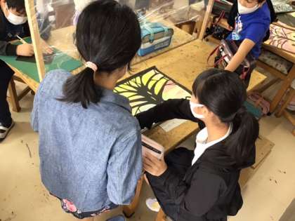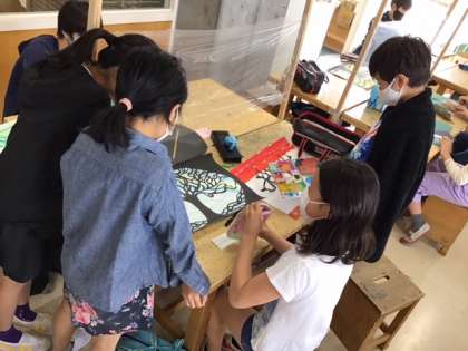 図工の時間です。「カット ピタッと 不思議な世界」とてもすてきな作品に仕上がっています。