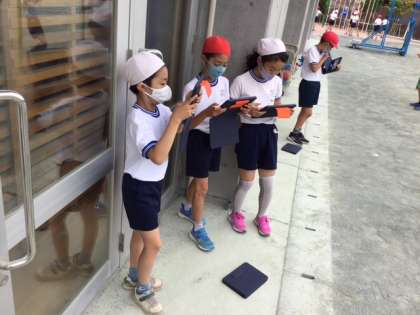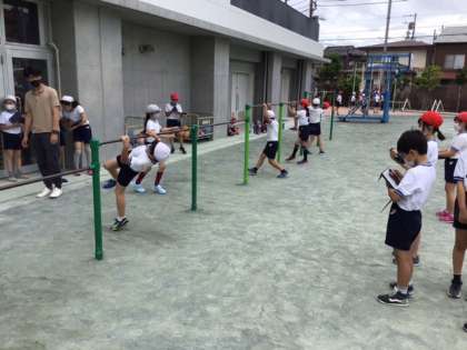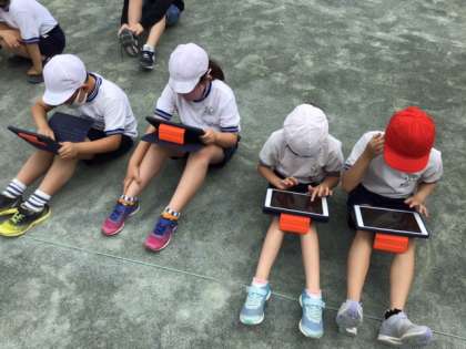 体育の時間です。鉄棒の技の動きを撮影して、自分の動きを確認することで次の練習に生かしています。
