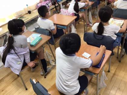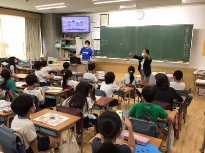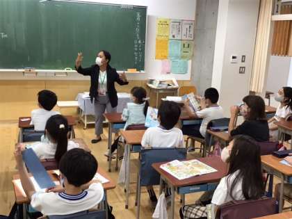外国語活動の時間です。シルビア先生と一緒に楽しく英語を学んでいます。