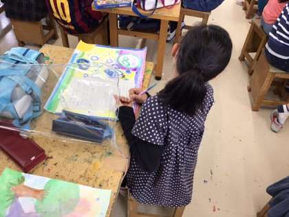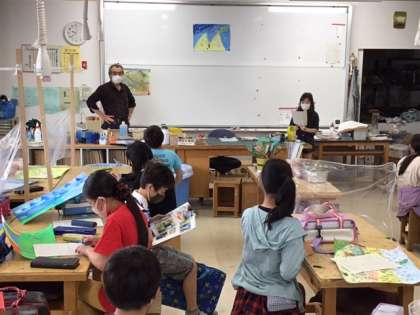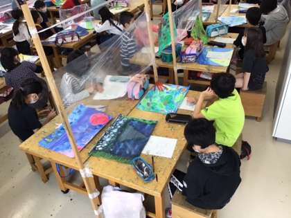 図工の時間です。「季節を感じて」注目した絵を選んで、質問などを交流しています。