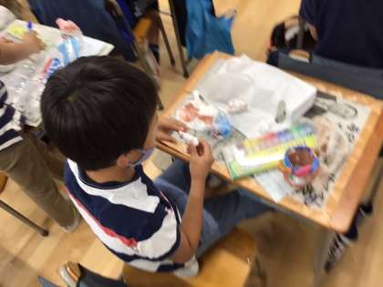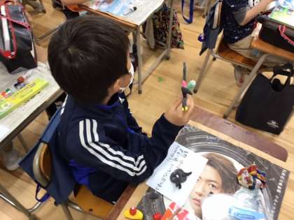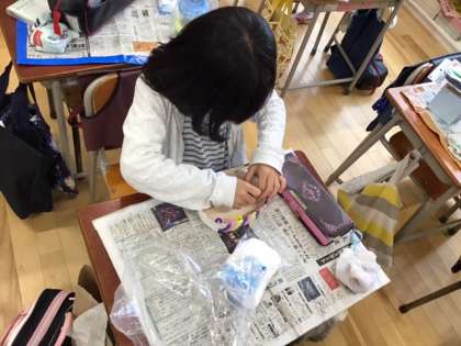 図工の時間です。紙粘土に絵の具を混ぜて、カラフルで役に立つ作品を作っています。