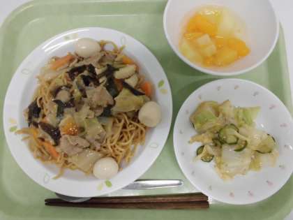 献立 五目あんかけそば、キャベツの中華サラダ、フルーツポンチ、牛乳