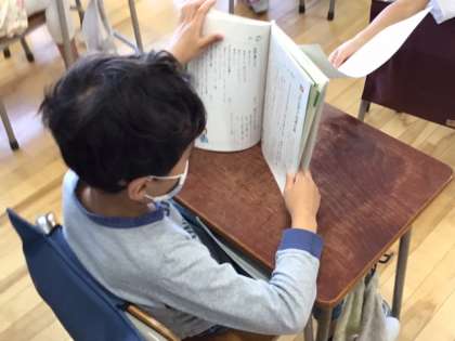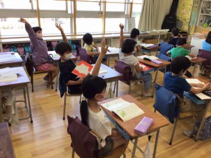 国語の時間です。「たんぽぽのちえ」今日は、たねを飛ばす知恵について考えます。