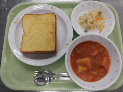 献立 フレンチトースト、トマトシチュー、きのこ入りキャベツサラダ、牛乳