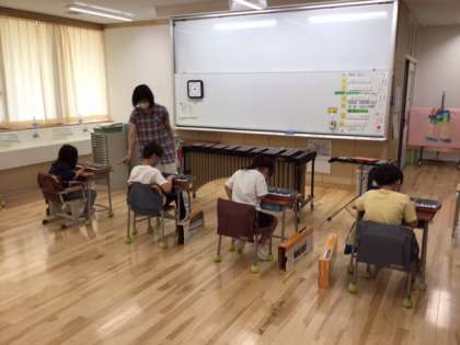 中学年の音楽の時間です。ミニキーボードの練習をしています。それぞれが自分の課題曲に挑戦しています。