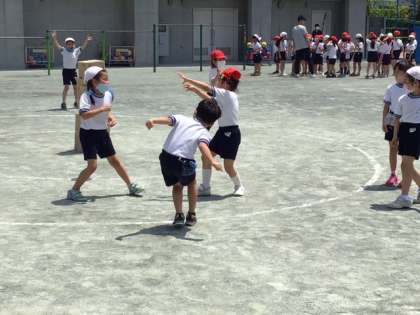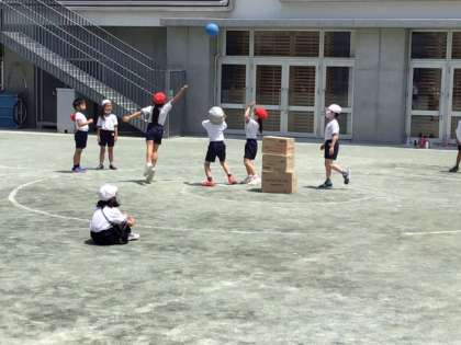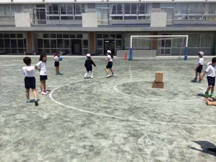 体育の時間です。円の中心に的をおいて、攻めと守りに分かれて的当てゲームをしています。