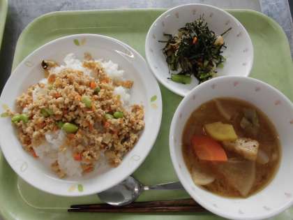 献立 ふわふわそぼろ丼、小松菜ののり和え、具だくさんみそ汁、牛乳