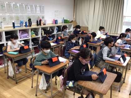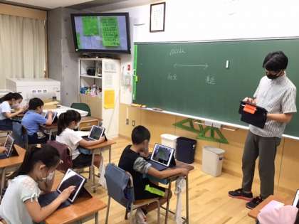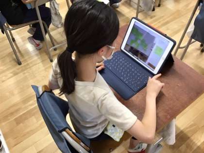 総合的な学習の時間です。各班の意見をiPadにデータで取り込んで、意見の交流を深めています。