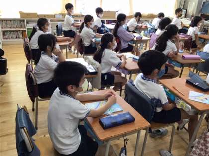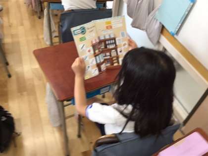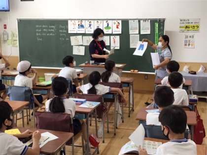 外国語活動の時間です。天気や衣服、スポーツなどをどんどん英語で表現しています。