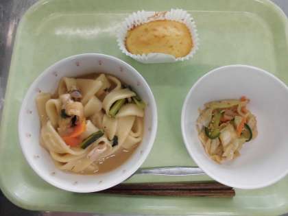 献立 おっきりこみうどん、こんにゃくサラダ、りんごケーキ、牛乳