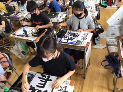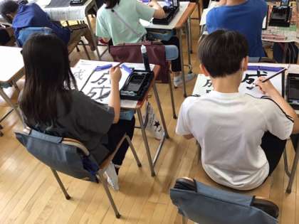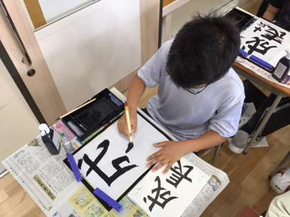 習字の時間です。今日の題字は、「成長」です。筆の入りと出を意識して練習しています。