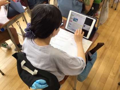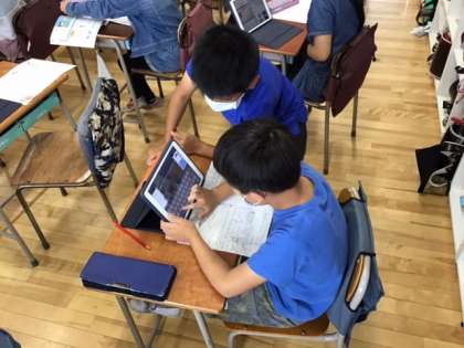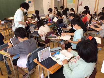 社会科の時間です。沖縄県の学習のまとめとして、新聞づくりに取り組んでいます。