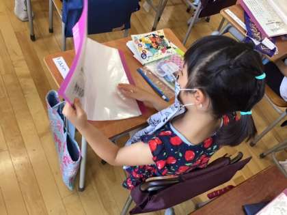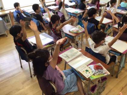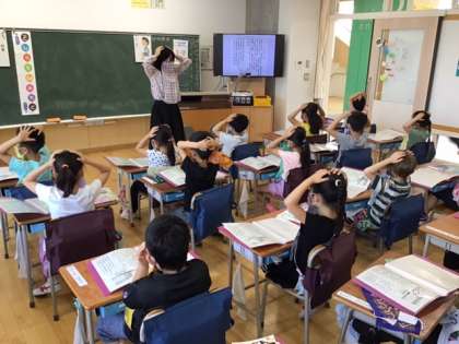 音楽の時間です。ドレミの歌に合わせて、ドレミ体操に取り組んでいます。