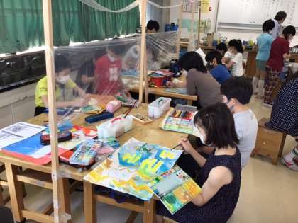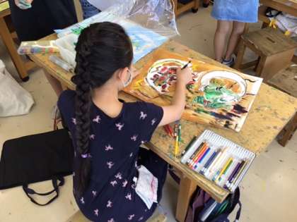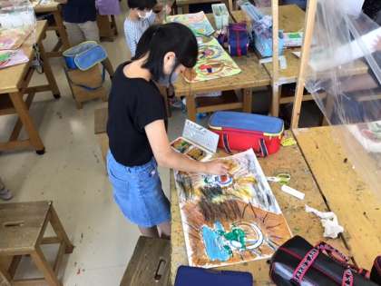 図工の時間です。「心を開いて 風神雷神」個性あふれる「風神雷神図屏風」が完成に近づいています。
