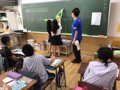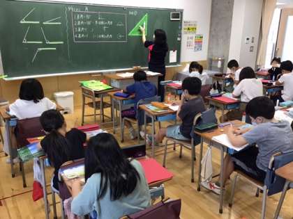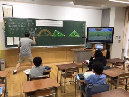 算数の時間です。角の大きさの学習をしています。分度器の使い方に慣れていきましょう。