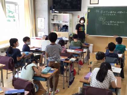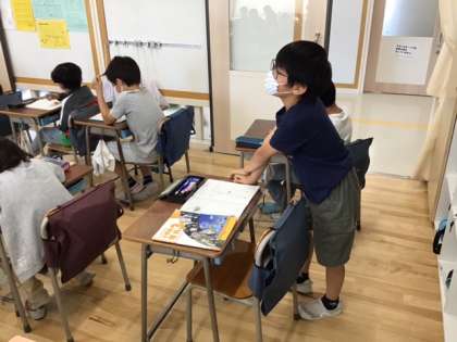 理科の時間です。影の場所は、時間が経つとどうなるか、今までの学習や経験などをもとに予想しています。
