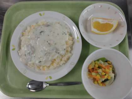 献立 チキンクリームライス、コーンサラダ、ジューシーフルーツ、牛乳