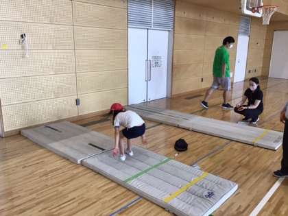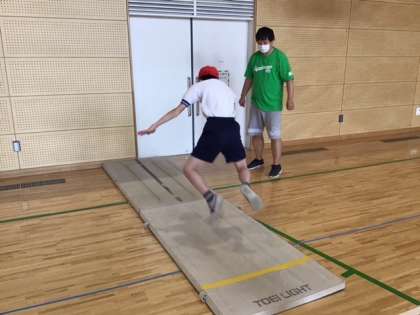 体育の時間です。体力テスト期間です。立ち幅跳びに挑戦しています。
