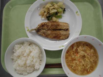 献立 ご飯、いわしのかば焼き、小松菜のごまじょうゆ和え、かきたまみそ汁、牛乳