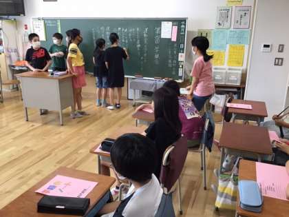 学級会の時間です。運動会スローガンのもとになるキーワードを話し合っています。